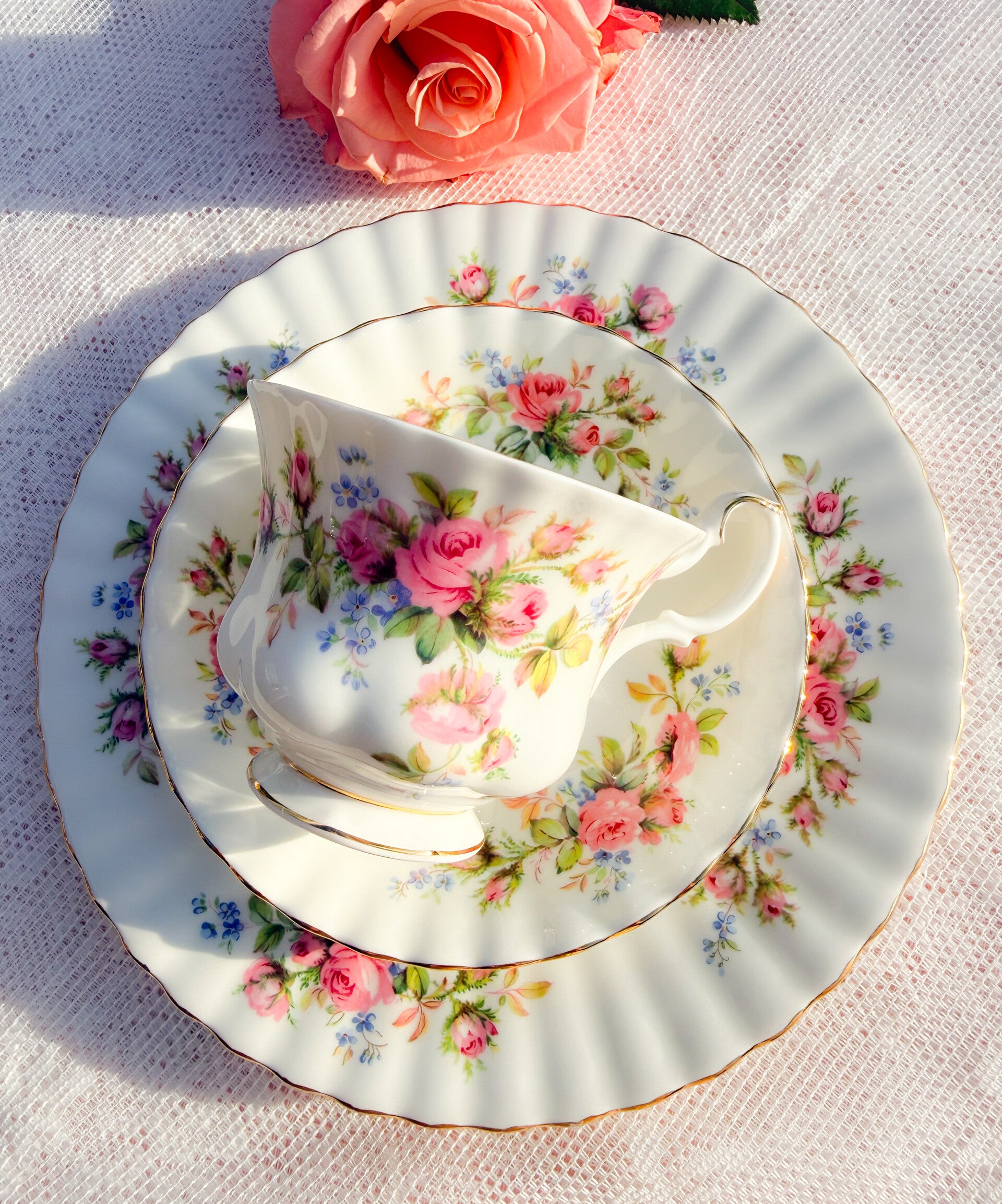 Brocante Engelse kopjes Royal Albert Moss Rose high tea servies